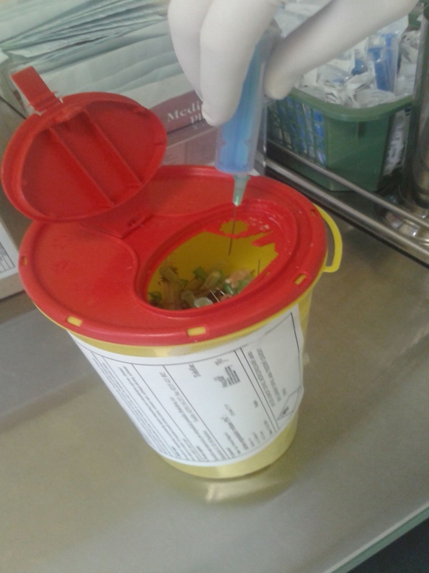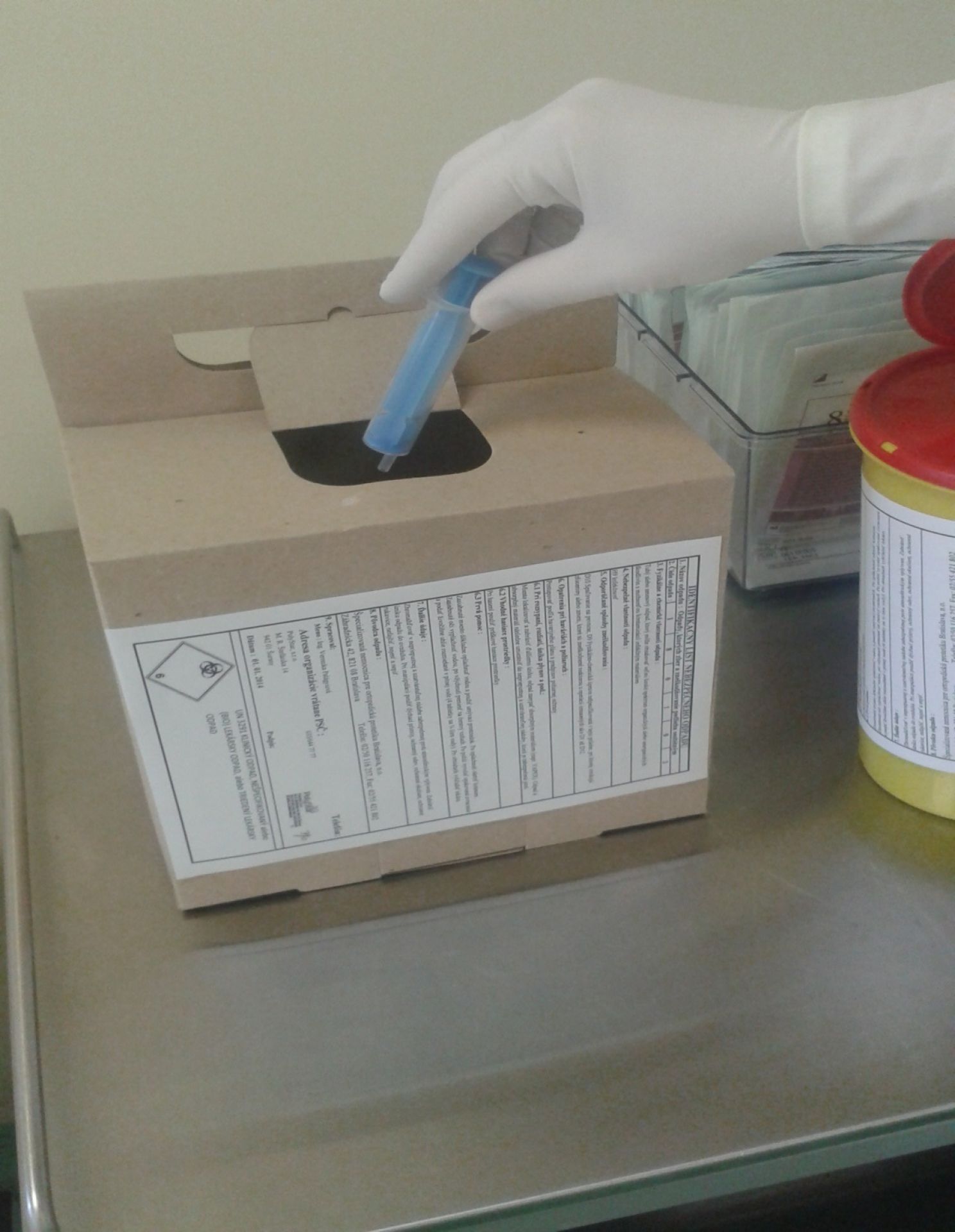 Použité jednorazové ihly, striekačky a iné ostré predmety sa zneškodňujú bez ďalšej manipulácie – čiže bez nasadzovania krytov, do hrubostenných nepriepustných nádob, ktoré sú uložené na ambulancii. Každá nádoba na odpad musí obsahovať identifikačný list nebezpečného odpadu.